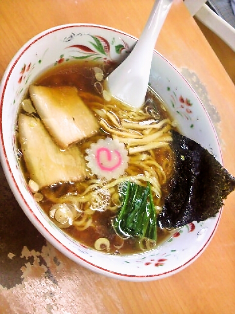 会津若松の『ふじ乃』 手打ち中華そば 500円 脂浮きはかなり多目です。 スープ鶏の旨味が凝縮されたようなコクに、魚介の旨味がプラス。 味は濃い目。 ちょっと白河ラーメンに近い感あり。 麺は中太縮れ。 手打ちで手切りなのだろう。 太さに微妙なズレがある。 チャーシューはバラ肉。 柔らかすぎず味付けもいい感じ。 白河と喜多方のいいとこどり的な感じかな。 けっこうインパクトある。 見た目も白河っぽいよね。 ほうれん草とかもxxx